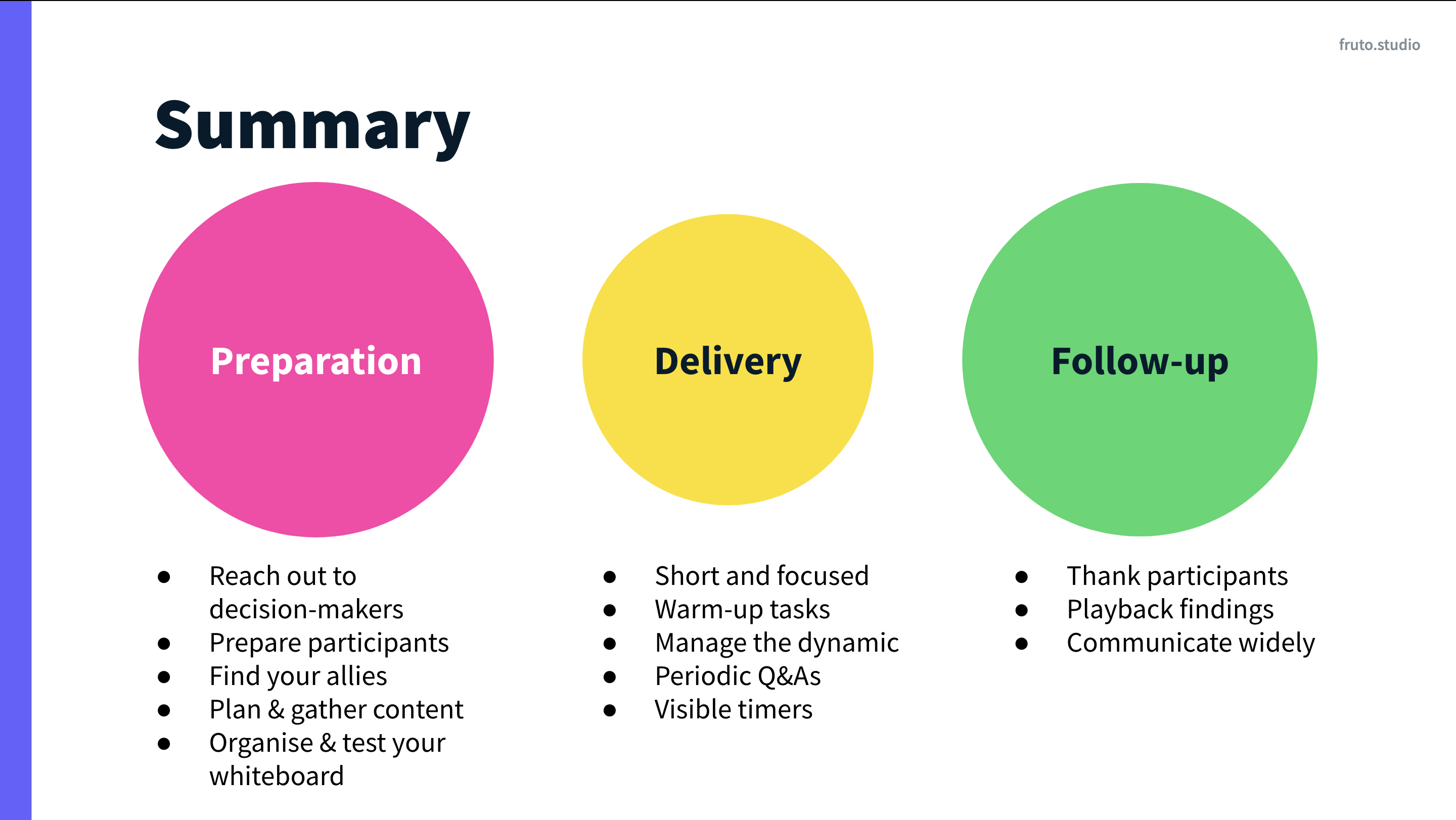 In this webinar, we show you how to get buy-in from key stakeholders, what pre-workshop activities we run to make sure it all goes smoothly, and tips on how to facilitate these sessions. We run through some workshop templates on Miro (which you can download and try for yourself), and how we communicate outcomes.